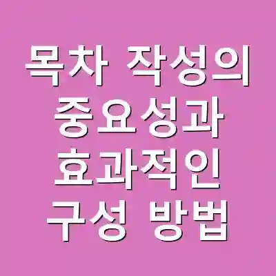 목차 작성은 문서의 효과적인 전달을 위해 필수적인 요소입니다. 독자가 필요한 정보를 쉽게 찾고 이해할 수 있도록 도우며, 문서의 전체적인 구조를 명확히 하는 데 기여합니다. 따라서 목차를 작성할 때는 명확한 제목 선정, 계층적 구조 활용, 시각적 요소 포함 등을 고려해야 하며, 독자의 요구에 맞춰 맞춤형으로 구성하는 것이 중요합니다.